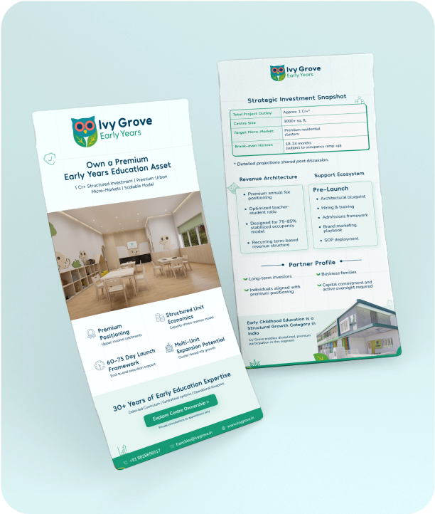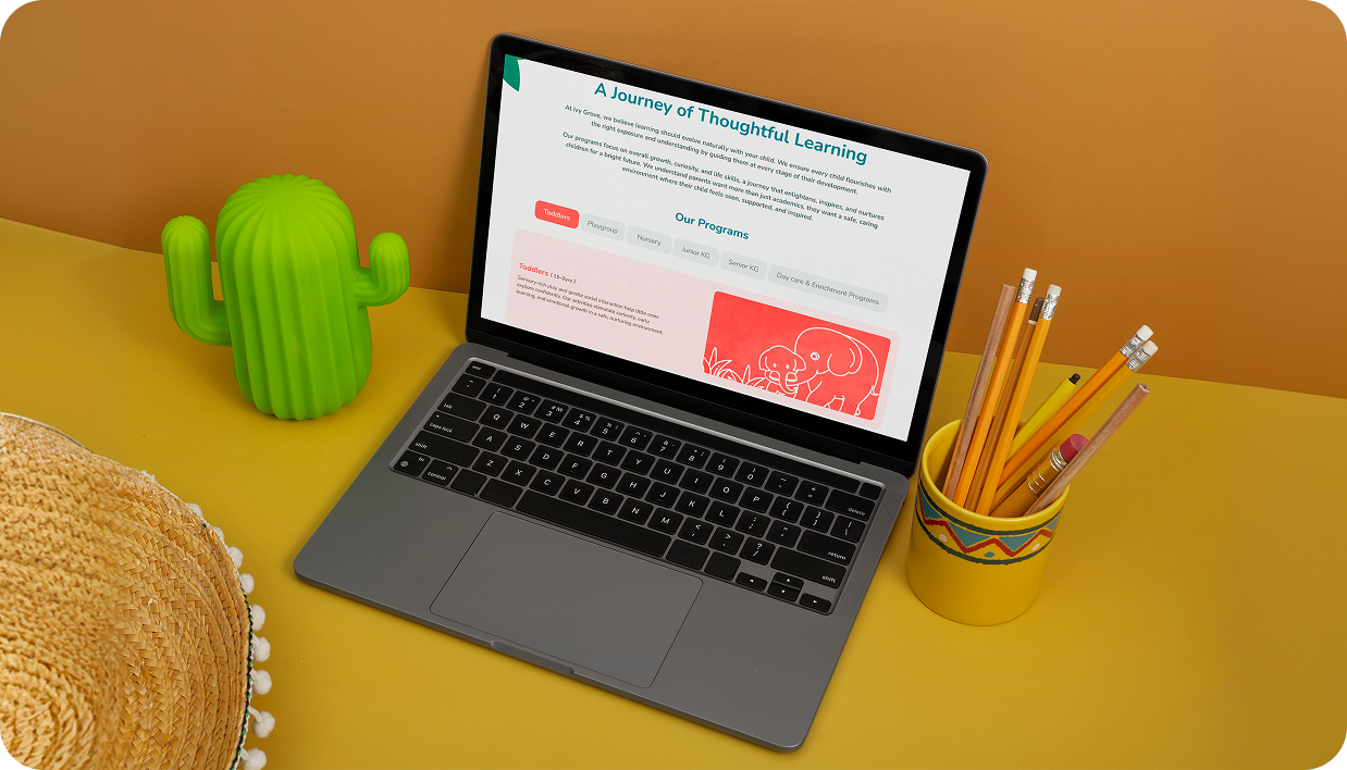 Early childhood education requires sensitivity, clarity, and trust. The brand needed to feel calm, premium, and emotionally reassuring to parents. Multiple touchpoints were made to stay consistent while addressing different audiences and emotional appeal. Every element needed to reflect Ivy Grove’s philosophy of gentle, mindful learning in every essence.